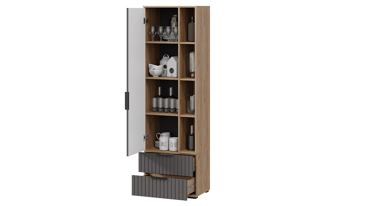 Стильная витрина Hilton объединяет тёплый дуб крафт и благородный графитовый матовый оттенок. Идеальна для демонстрации коллекционной посуды и декоративных предметов. Прозрачные фасады со стеклом позволяют любоваться содержимым, а встроенное освещение создаёт уютную атмосферу. Выразительный дизайн станет акцентом гостиной, подчёркивая изысканный вкус владельца.